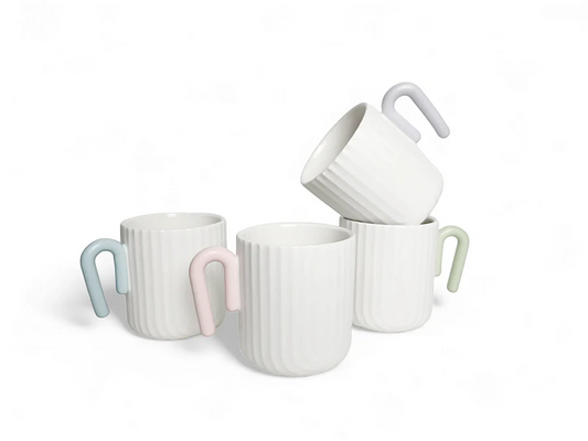 GABEL AND TELLER - Matte White Scallop Mug with Pastel Colour Handle - Set of 4