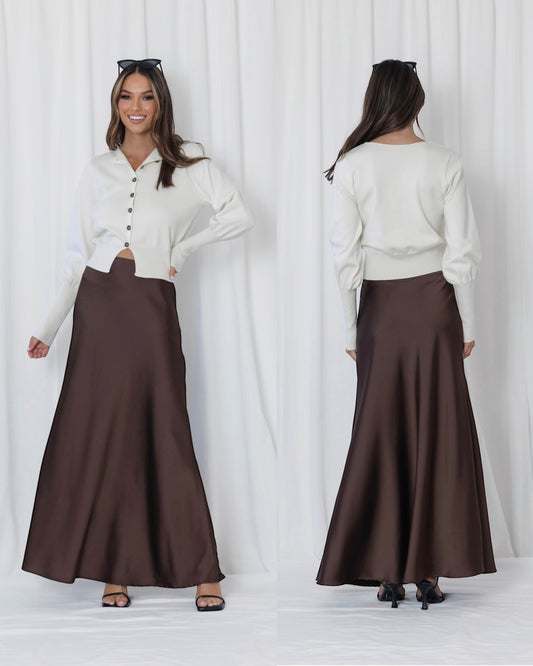 LOVE LILY THE LABEL - Elle High Waist Bias Cut Satin Maxi Skirt - Coffee