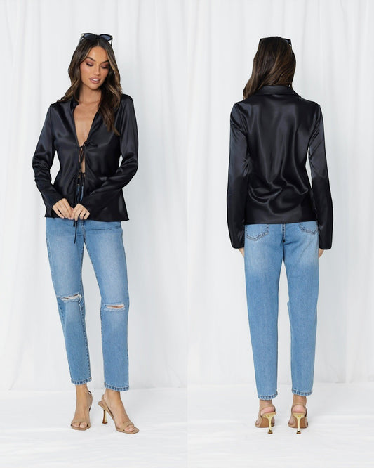 LOVE LILY THE LABEL - Gigi Satin Tie Front L/S Blouse - Black