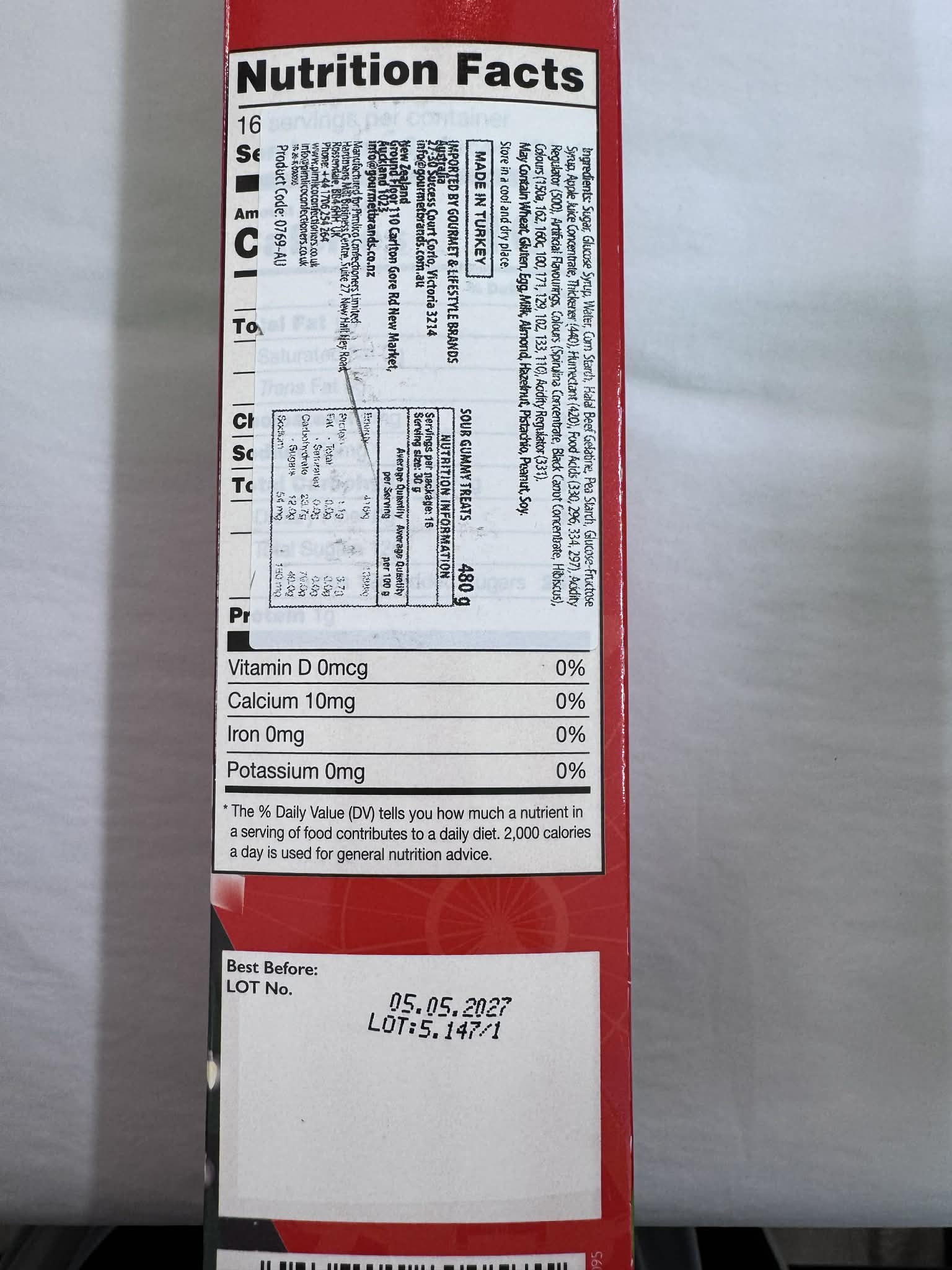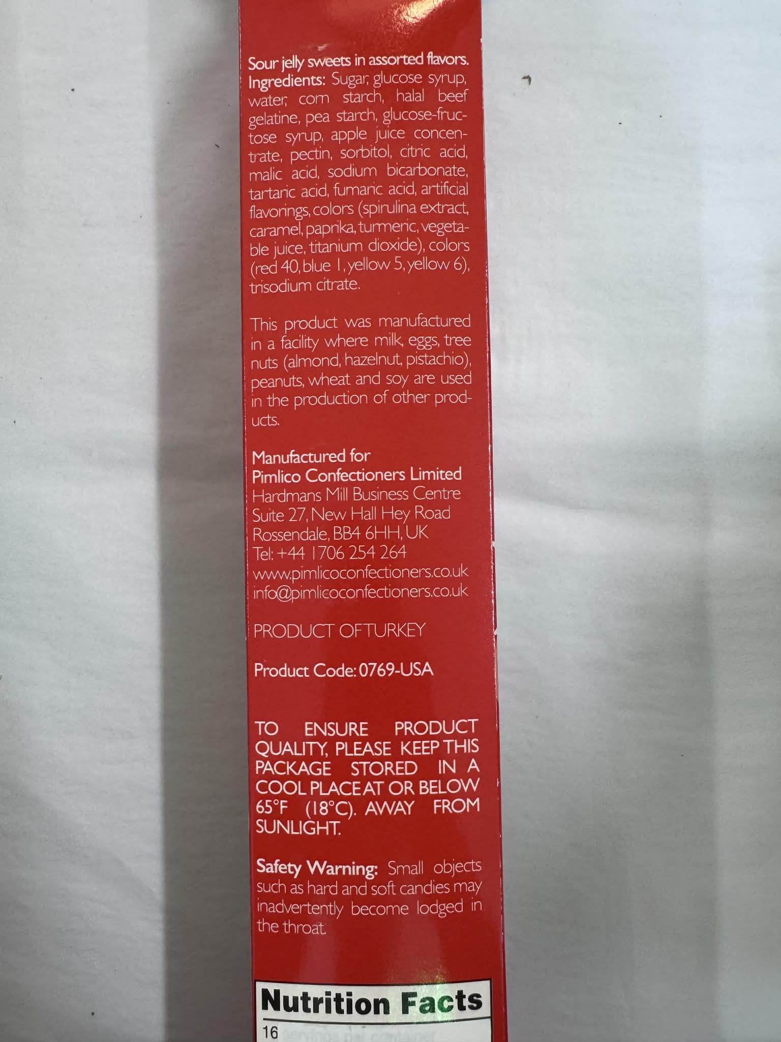 Product Ingredients: Sugar, Glucose Syrup, Water, Corn Starch, Halal Beef Gelatine, Pea Starch, Glucose-Fructose Syrup, Apple Juice Concentrate, Thickener (440), Fruit Concentrate (420), Food Acids (230, 296, 334, 297), Acidity Regulator (500), Artificial Flavourings, Colours (Spirulina Concentrate, Black Carrot Concentrate, Hibiscus), Colours (150a, 162, 160c, 100, 171, 129, 102, 133, 110), Acidity Regulator (331).