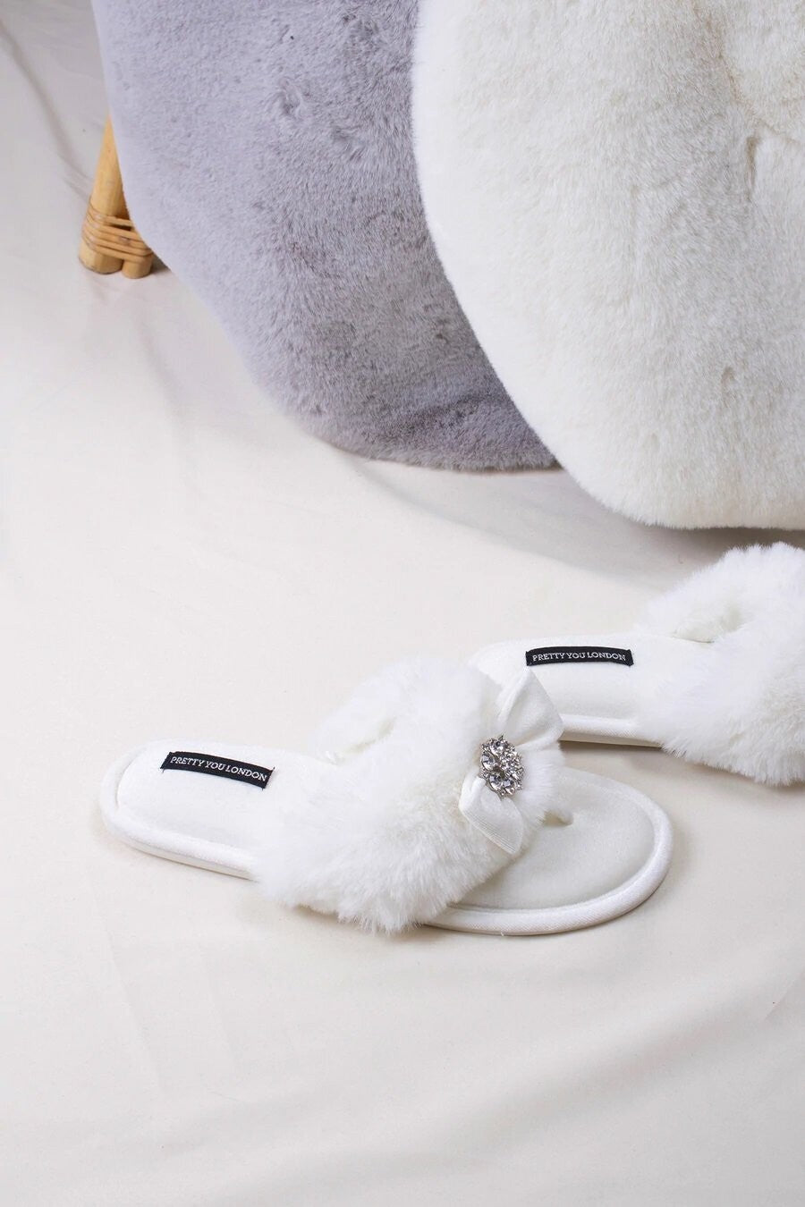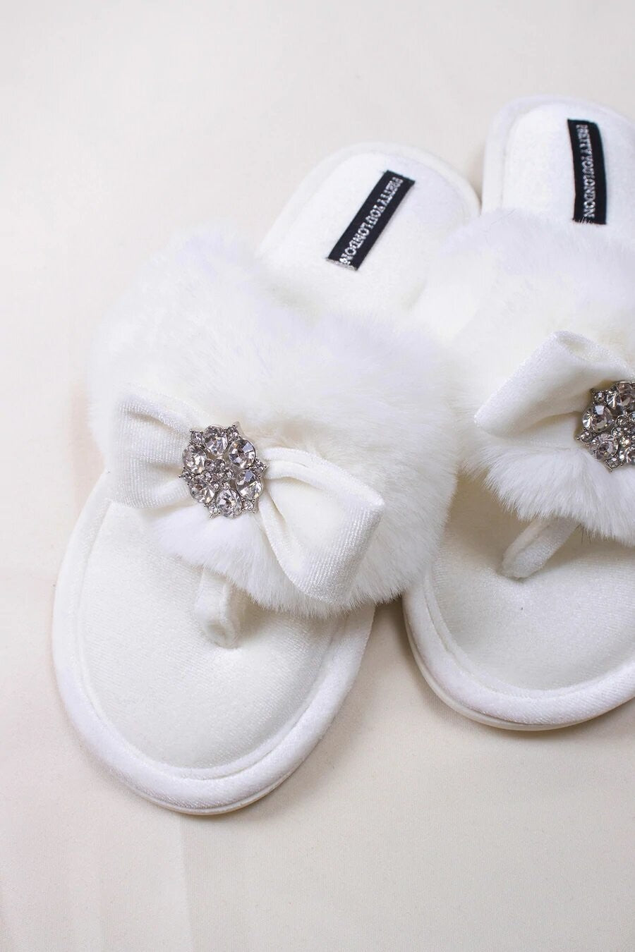 The Amelie is a slipper for every season; this elegant toe-post style has a crushed velvet padded footbed that gives long-lasting wearability and irresistible comfort. A premium crushed velvet bow finished with a striking diamante embellishment atop a plush faux fur band with slip resistant indoor/outdoor branded sole. Free your pedicure and feel your prettiest.